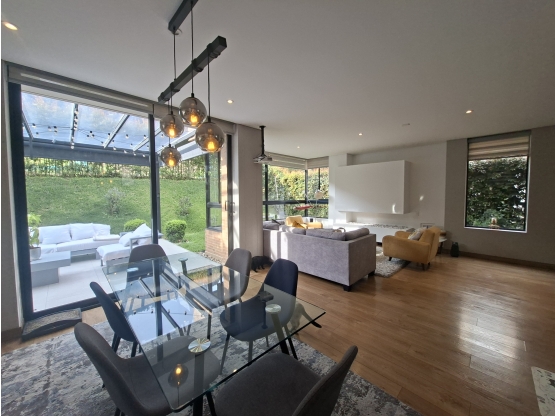 CALIDEZ Y BUEN GUSTO, definen esta bella opción para vivir en Cajica, en ella. encontrarás confort, comodidad y mucha calma por vivir rodeada de naturaleza, esta magnífica casa nos enseña que la diferencia está en los detalles. Su espectacular diseño pensado en hacer que la luz natural esté presente en cada espacio, generando amplitud y calidez, además de permitir disfrutar del verde de su entorno, su antejardín y zona verde interior brindan privacidad y paz. La terraza del primer nivel, cubierta, nos permite seguir disfrutando aún en los dias de lluvia. Dotada con un amplio espacio para los infaltables asados y en el interior la cocina abierta que se conecta con el área social facilitando el compartir la preparación de los alimentos o el cafesito de la tarde si preferimos encender la chimenea del salón y quedarnos alli, en las tertulias de los fines de semana. Ambientes para cada ocasión, que según el estado de ánimo, el número de personas que estén en casa o el evento que estemos celebrando, daremos uso al que mejor se ajuste. Sus amplios ventanales  de piso a techo nos permiten unir los dos ambientes en un momento dado y pasando del disfrute de la casa a las responsbalidades, si eres de los que trabajan en casa,  el estudio ubicado en el primer nivel, es sin duda un plus, lindo iluminado con dos ventanas una de ellas con vista al jardin interior y la otra al jardin exterior.